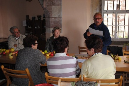 Die Gäste hatten frische Äpfel und eine Menge Fragen mitgebracht. Die verschiedenen Sorten aus den eigenen Gärten wurden übersichtlich auf dem Tisch ausgebreitet und die Bestimmung konnte beginnen. Einige Exemplare wurden gleich erkannt und benannt. So fanden sich unter den rotbäckigen Früchten Schlotteräpfel, Kaiser Wilhelm, Gravensteiner, Boskoop, Sternrenette und Jakob Lebel. Auch der Geschmack wurde bewertet. Kleine Apfelschnitze machten die Runde und an den Gesichtszügen konnte man ablesen, ob die Kostproben mild-säuerlich, knackig, wohlschmeckend, aromatisch, saftig, mehlig oder süß waren.